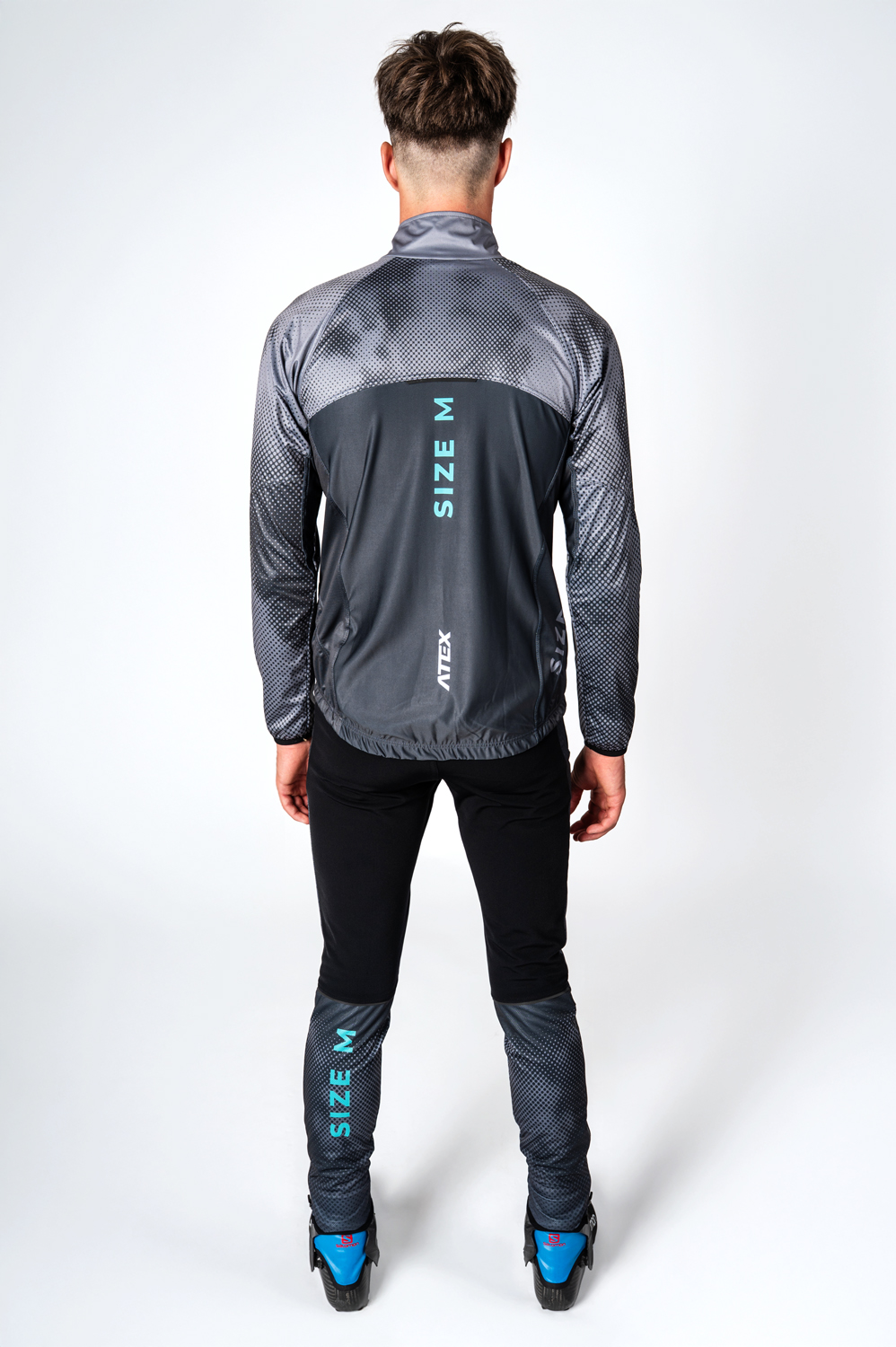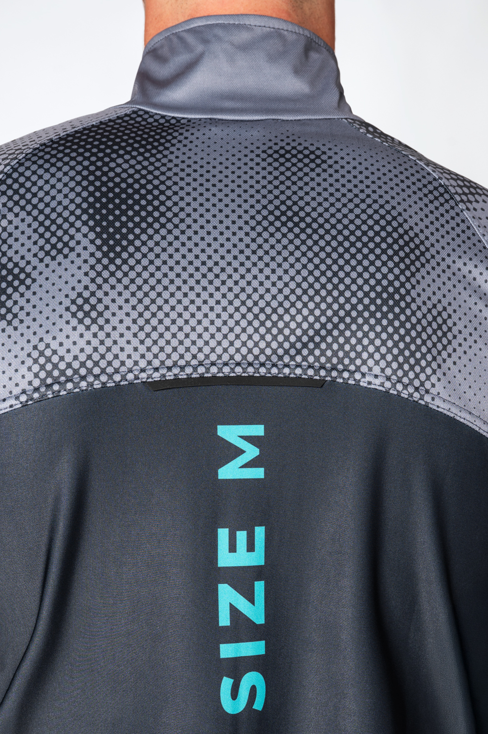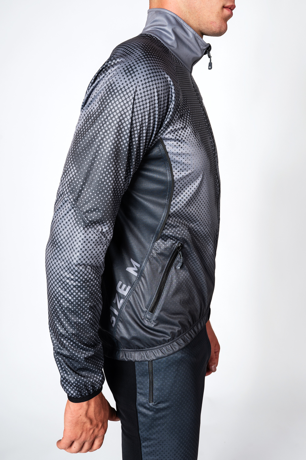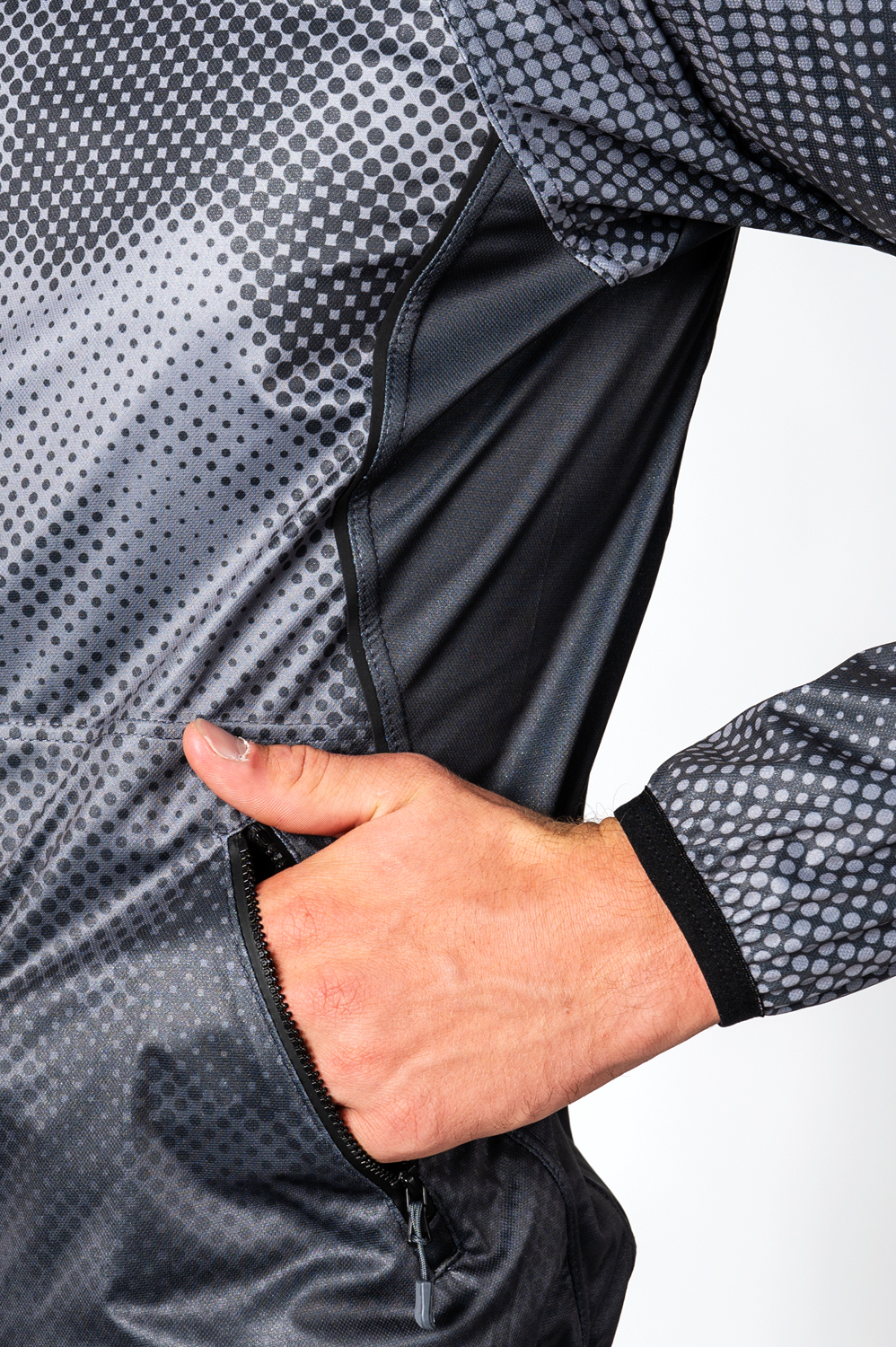 The racing and running gilet in a semi-fitting design is ideal especially as a men’s or unisex version. The jacket has dual-fabric construction: main part is made from lightweight three-layer membrane Zerowind material that is resistant to wind and moisture. Middle back part is made from stretch and soft Roubaix material for better breathability and allowing full range of motion for a sportsman. Jacket is anatomically shaped and you will surely appreciate a stand-up collar with a drawstring, full waterproof zip with covers at both ends and two zip pockets at the front. Raglan sleeves with a stretch panel in the armholes are hemmed with an elastic and elastic cuffs with a thumb hole. Bottom hem of the jacket has a silicone elastic gripper to keep the jersey in place while running. In addition distinctive reflective details are at the back and front. Chest zip pocket or back pockets can be added at your request together with your own design on the grey areas as seen in the picture.