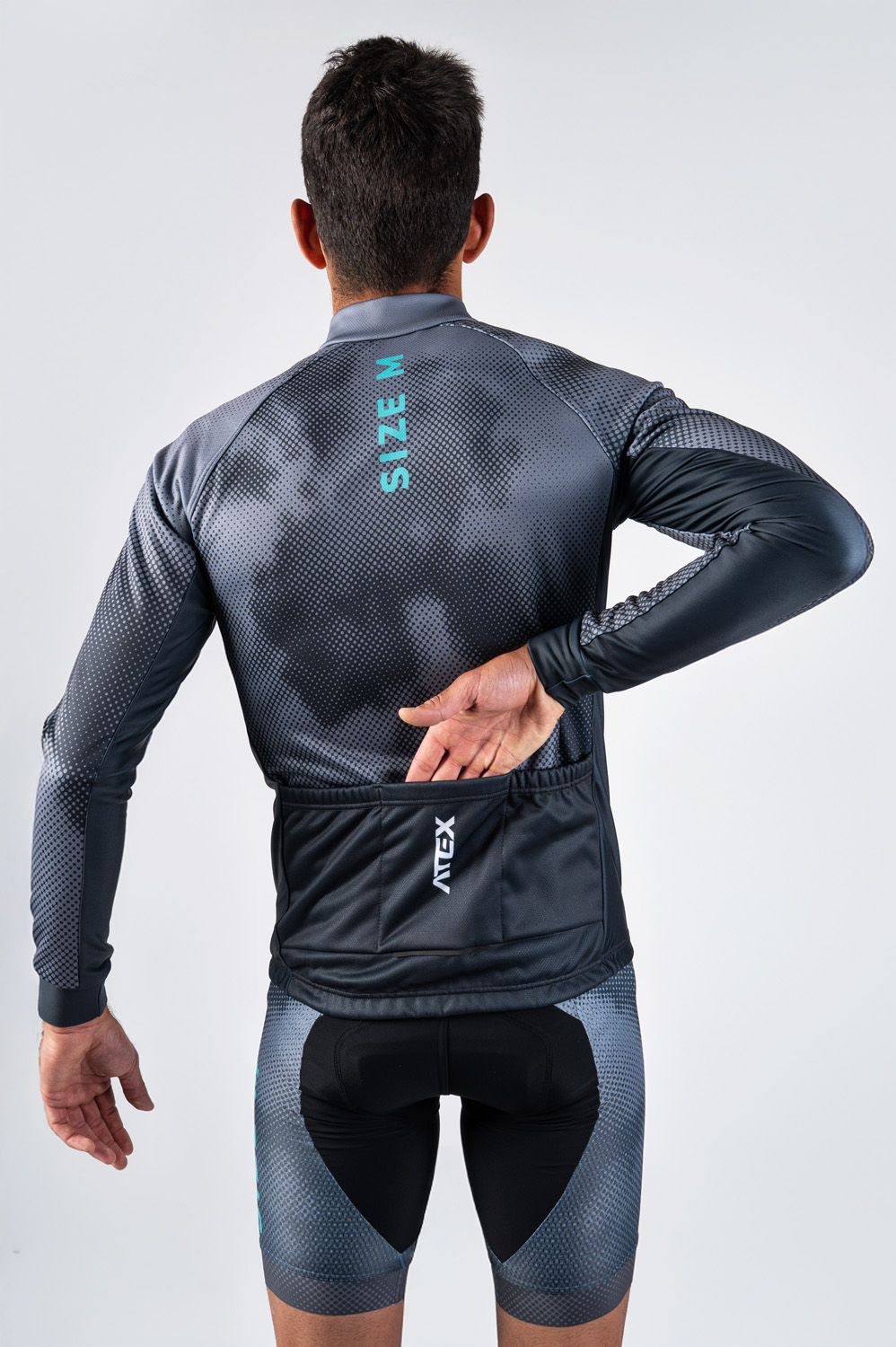 The cycling jacket is made in combination of two materials. The basic one is a three-layer membrane Zerowind material resistant to wind and moisture. Side panels and inner sleeve panels are made from very stretch Roubaix material for better flexibility and breathability. Jacket has semi-fitting design, full-length underlaid zip, triple rear pocket with reflective details and raglan sleeves with stretch cuffs and silicon gripper in the bottom hem. At request we can add fourth rear zip pocket (as seen in the picture) or only one big zip pocket. The basic model comes in warm Zerowind material but can be also made in lightweight Zerowind Light material.