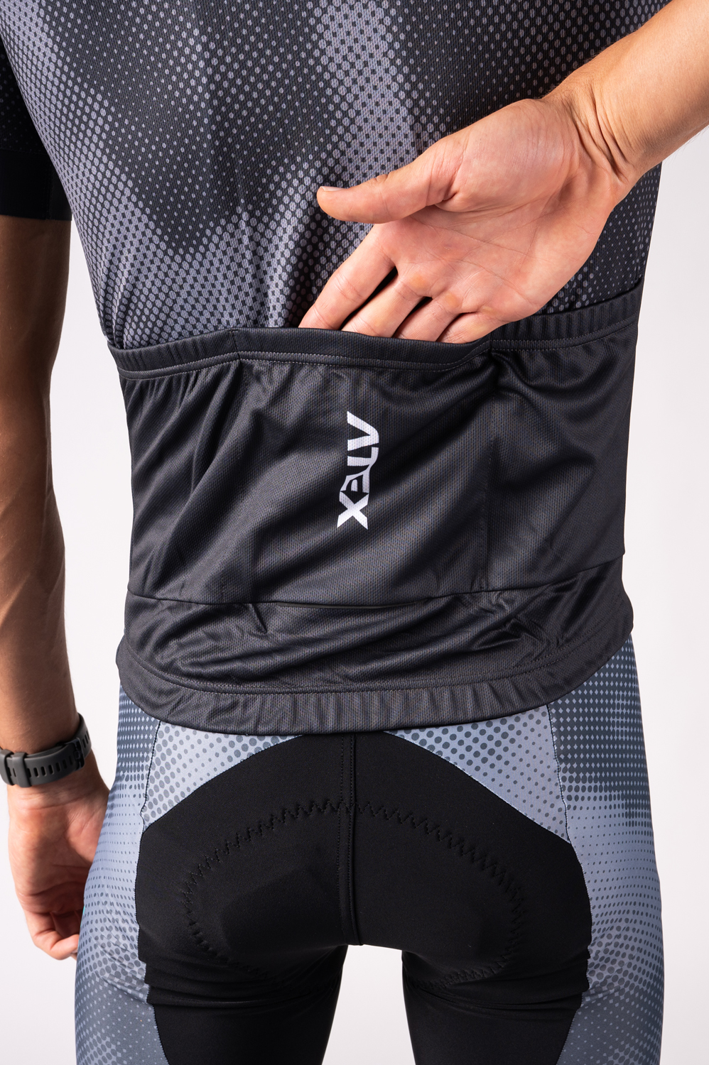 sport design, wide elastic in sleeve hems, coolspark material, triple rear pocket, reflective details, silicone waist gripper.