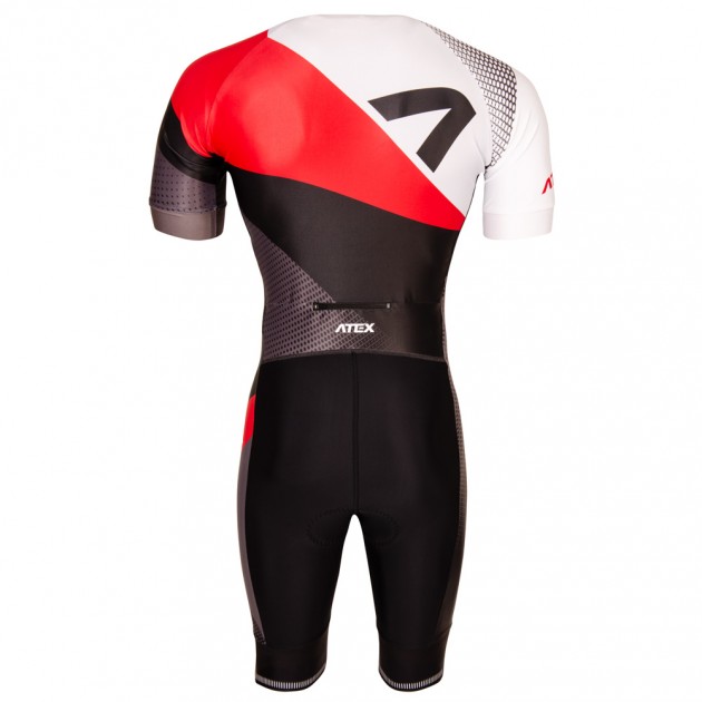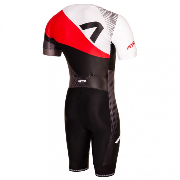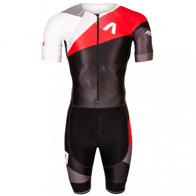 The men’s triathlon suit is in a close-fitting design and made from very stretch Espan material. You can find an underlaid zip with cover at the front, round neckline with a small elastic, short raglan sleeves hemmed with 4cm-wide fine elastic gripper. There is also a rear zip pocket, length finishes at knees and trouser legs are hemmed with 7cm-wide fine elastic gripper with reflective trim. Suit includes top-quality Triathlon padding.