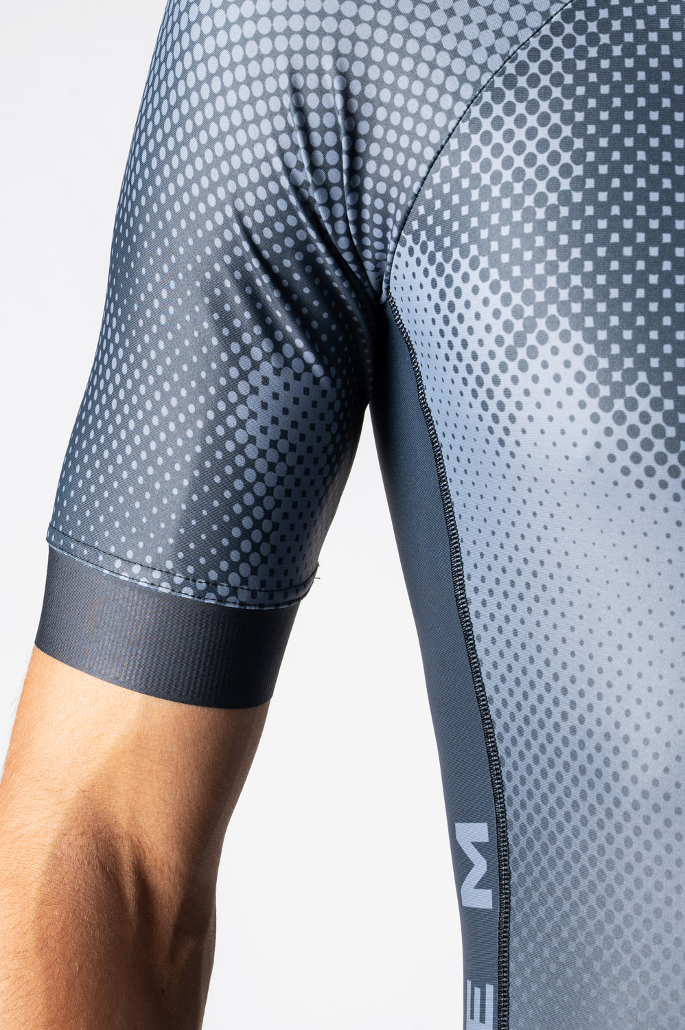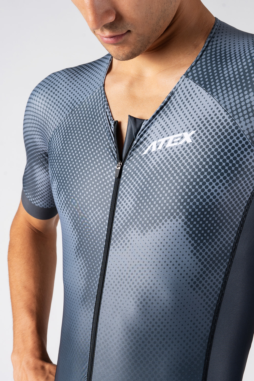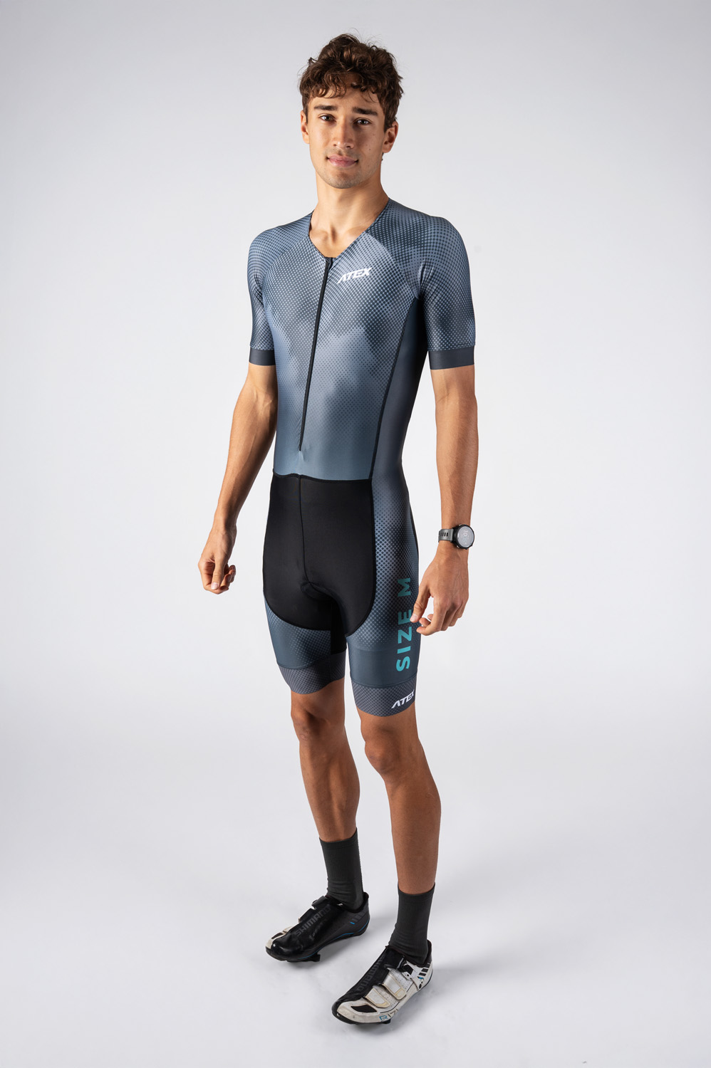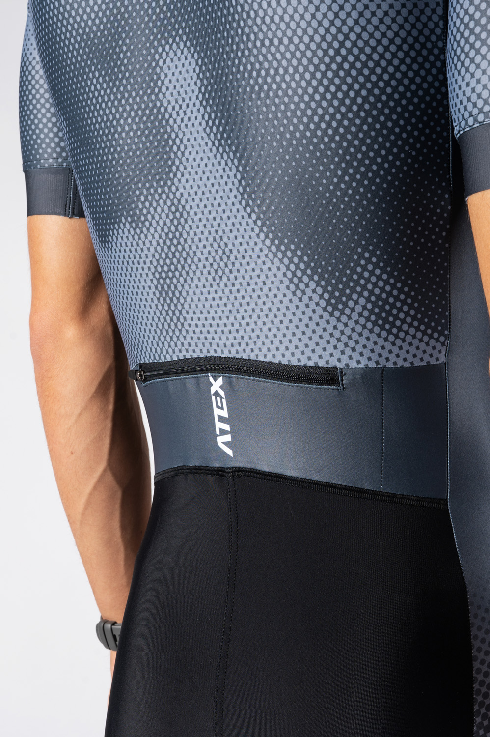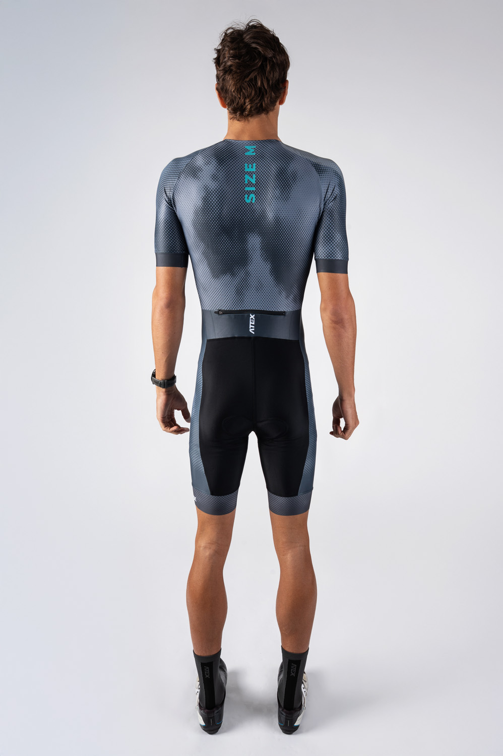 The men’s triathlon suit is in a close-fitting design and made from very stretch Espan material. You can find an underlaid zip with cover at the front, round neckline with a small elastic, short raglan sleeves hemmed with 4cm-wide fine elastic gripper. There is also a rear zip pocket, length finishes at knees and trouser legs are hemmed with 7cm-wide fine elastic gripper with reflective trim. Suit includes top-quality Triathlon padding.
