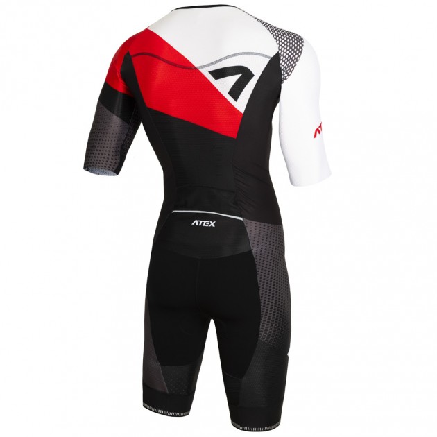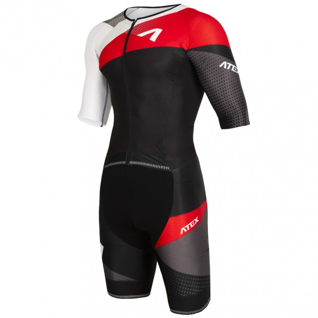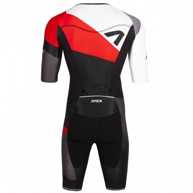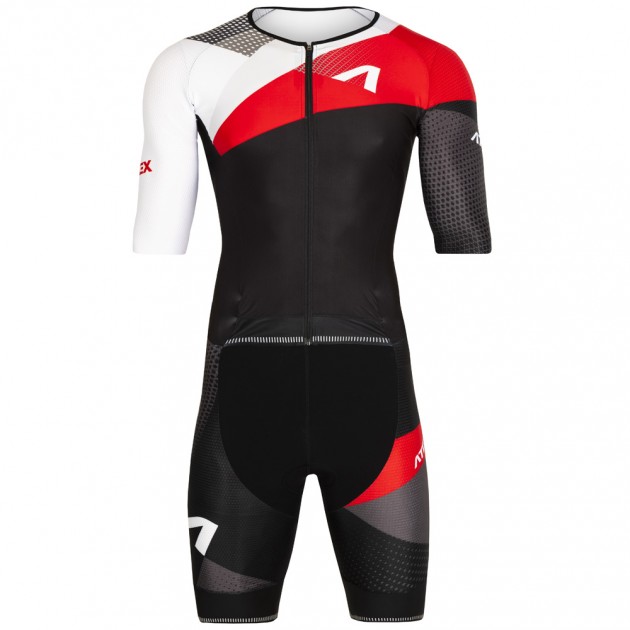 Men’s triathlon suit with short sleeves has a close-fitting, anatomically shaped design and consists of three different functional fabrics. The base of the upper part is made of very flexible, light and soft material Fitex. Raglan sleeves and the middle of the back part are made of speed, slightly compressive material Velaro that has a special knit for better breathability and airflow. The bottom part of the suit consists of two fabrics. Velaro is used for the sides of the legs and the middle part of the leg is made of Tritech that dries really quickly. On the front part, there is a full length zipper with a lock down system that makes it possible to partly or completely unzip the upper part and therefore it is easier to put the suit on. The V-neck has a thin and flexible hem. The raglan, elbow-length sleeves have a clean-cut edge. On the back part, there is a larger pocket with an overlay. The trouser part is raised in the waist area, so it creates an overlap in the point of opening the zipper. We put a thin glued edging rubber around the waist. The knee-length trousers are hemmed with 7cm wide, soft and nonslip rubber. In the crotch area, there is a Triathlon pad and the seams are glued together. The suit comes with reflective elements. It is possible to produce the suit without the back pocket at your request.